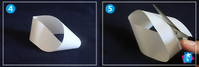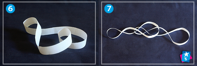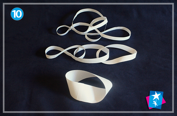 Щоб отримати стрічку Мебіуса, треба взяти паперову смужку та склеїти її кінці. Один з кінців при склеюванні повертається на 180⁰. Зверніть увагу на фото 2 і 3, як саме поєднуються кінці між собою. А на фото 4 зображено, як виглядає готова фігура.