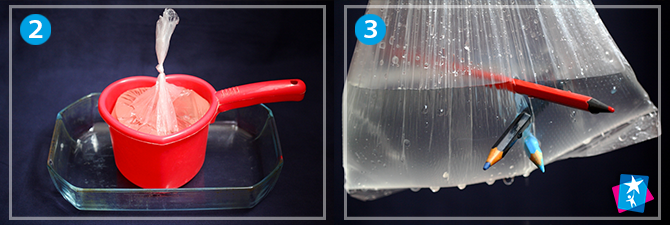 Налийте в пакет воду. Зверніть увагу, що поліетилен НЕ має бути дуже тонким, бо пакет розірветься вже від тиску самої води. У наповнений пакетик починайте втикати олівці з гострим кінцем «навиліт». Якщо все зробити правильно і обережно, результат здивує дитину. Дірявий пакет збереже воду всередині, так само, як і цілісний.