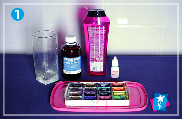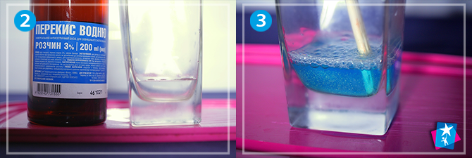 Налийте у склянку 30—50 мл перекису водню. Додайте трохи миючого засобу. Підфарбуйте, розмішайте.