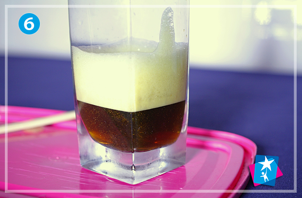 Далі залийте йодид калію. Відбудуться цікаві перетворення: виділиться йод та забарвить розчин у жовто-коричневий колір. А також перекис водню розкладеться на воду і кисень — пухирці збільшать об’єм суміші. Йодид калію прискорить хімічний процес — отримаємо густий шар мильної піни зверху.