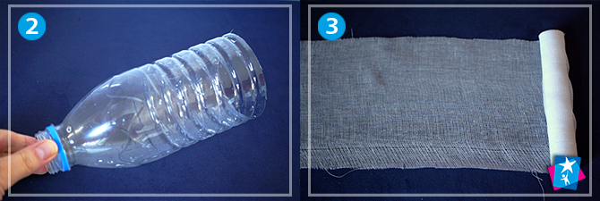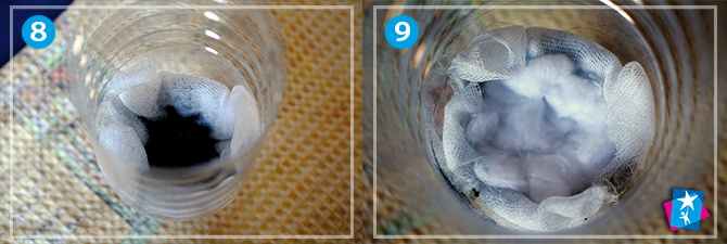 Візьміть прозору чисту пляшку з-під молока або води. Обріжте денце. В широкий бинт або марлю вкладіть вату, обмотайте кількома шарами. Помістіть у імпровізовану лійку з пляшки.