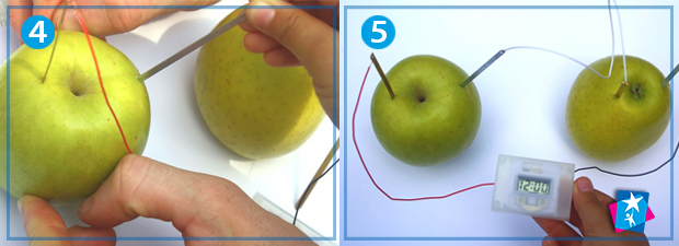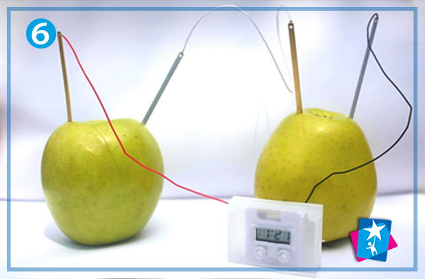 Покажіть дитині, яким чином батарейки виробляють струм. Помістіть пари з’єднаних між собою цинкових і мідних пластин у середовище, яке містить електроліт. Електроліт — рідина-провідник струму (у нашому випадку це яблучний сік). Підключений до яблук електронний годинник запрацює, коли між металами, поміщеними в яблука, відбудеться хімічна реакція і виробиться струм.