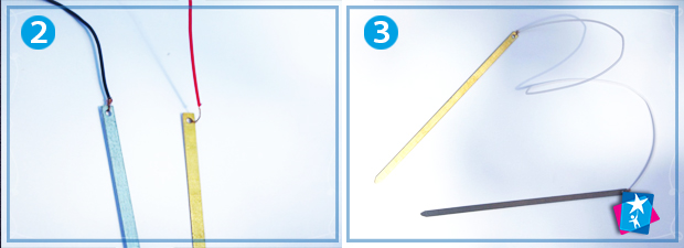 Розкажіть дитині про загальноприйняті позначення позитивного і негативного полюсів. Позитивний позначається червоним плюсом (+), негативний — чорним мінусом (-). Негативний чорний дріт підключаємо до цинкової пластини, а позитивний червоний — до мідної. Оголений кінець дроту і пластина мають дотикатися.