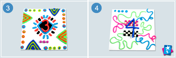 Почніть створювати фон для першого панно. Не потрібно нічого продумувати заздалегідь, дайте простір фантазії дитини. Ось підказка, які елементи можна використовувати в роботі: кульки, кубики, ковбаски, трикутники, прямі та хвилясті лінії, ромби та ін. Фон можете оформлювати за бажанням: в горизонтальну й вертикальну смужку, квадрати, кола, квіточки, абстрактні мотиви.