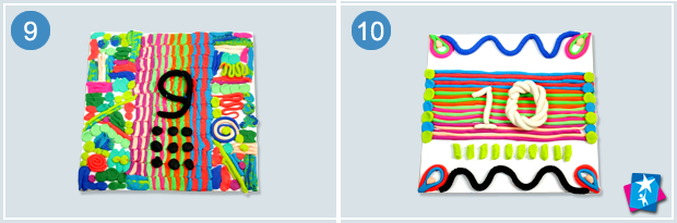 Якщо ви візьмете десять основ для кожної цифри, готові роботи можна помістити під скло, дещо притиснувши пластилін. Пластилінові панно з цифрами, розставлені на полиці, щодня допомагатимуть дитині запам’ятовувати послідовність першого десятка чисел.