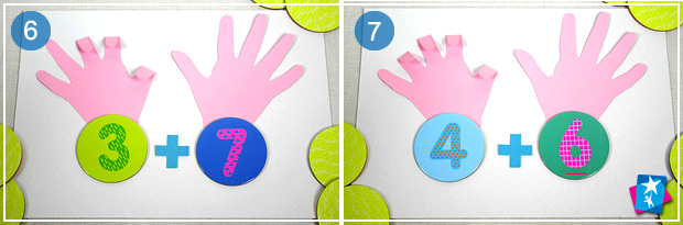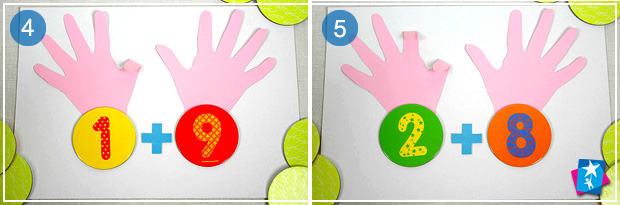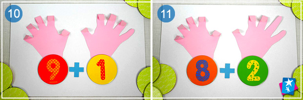 Поясніть дитині, що на двох руках 10 пальців. Попросіть загнути 1 палець на паперовій руці й порахувати ті, що лишилися. Нехай дитина покладе під ліву ручку цифру 1 (скільки зігнутих пальчиків), під праву — дев'ять (скільки лишилося). У сумі пальчики дають 10 (рахуємо всі пальчики разом).