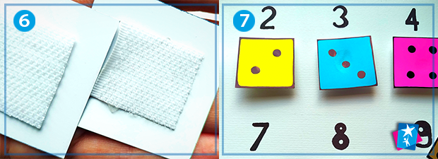Стрічку з липучками можна купити в магазині для шиття. Вирізаємо 10 квадратиків зі стрічки-липучки, розділяємо, одну частину клеїмо на ігровому полі під цифрою, а іншу — на картку-доміно. Ось і все — можна перемішувати різнокольорові картки та давати дитині завдання. Вдалої гри!