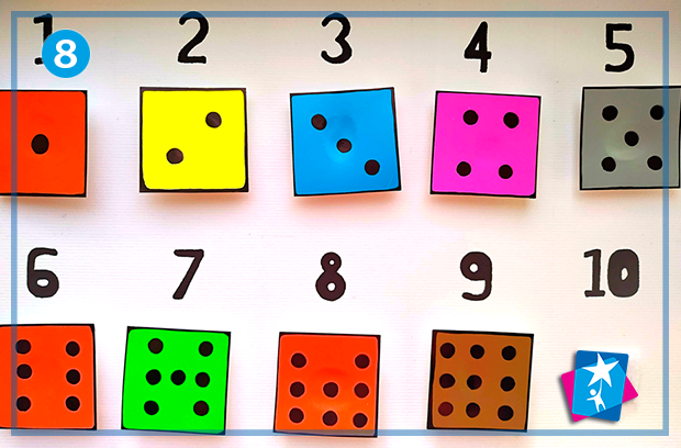 Далі вирізаємо з кольорового картону квадратики 5х5 см. На кожному кружечками вимальовуємо маркером числову відповідність — від 1 кружечка до 10. Це трохи нагадує доміно або гральний кубик.
