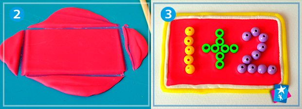 Розкачайте качалочкою яскравий шар пластиліну. Виріжте прямокутну форму. Розміри прямокутника залежать від розміру ваших бусин та довжини прикладу.