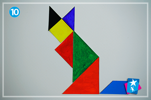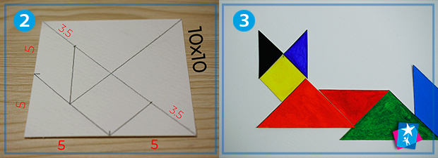 Виріжте з акварельного паперу квадрат 10х10 см. Нанесіть всередині нього розмітку, як на фото 2. Розріжте по частинах та розфарбуйте їх. А тепер пробуйте викласти наступних тварин: кішка, риба, собака, ведмідь, верблюд, заєць, гусак, лисиця.