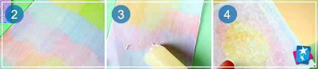 Заштрихуйте фон різнокольоровими олівцями. Можна використовувати і фарби, але доведеться чекати їх висихання. Натріть поверхню розфарбованого картону восковою або парафіновою свічкою. Шар має повність заповнювати формат. Якщо віск недостатньо покриє основу, то чорна гуаш профарбує папір і не вийде контрастної графіки. Якщо перестаратися і дати занадто товстий шар воску — продряпувати малюнку буде легко, але в маленьких деталях віск буде відділятися цілими шматками. Тому варто знайти "золоту середину" і зробити віск надійним бар'єром між світлим фоном і чорною заливкою.