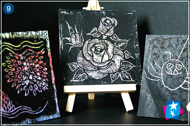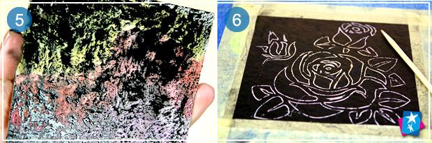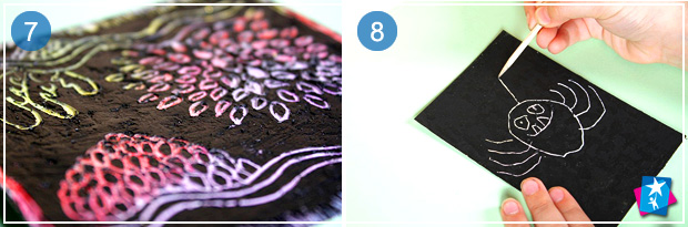 Після того як заливка чорною гуашшю виконана, а шар фарби висох — беремо гострий предмет (спицю, зубочистку, бамбукову шпажку) і продряпуємо малюнок на поверхні. Можна імпровізувати, а можна використати трафарет чи перевести будь-який роздрукований малюнок натисканням. Після того, як у вас будуть готові основні нариси майбутнього малюнка, перейдіть до промальовування деталей.