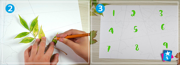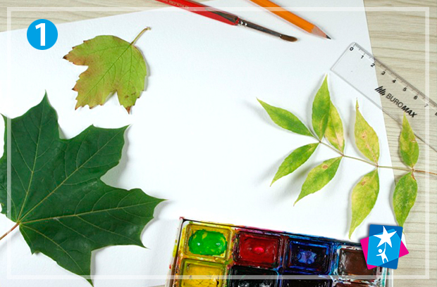 На акварельному папері формату А4 викладіть листочки та обведіть їх олівцем без сильного натиску. За законами композиції крупні форми краще розміщувати внизу, дрібні та делікатні — у верхній частині.