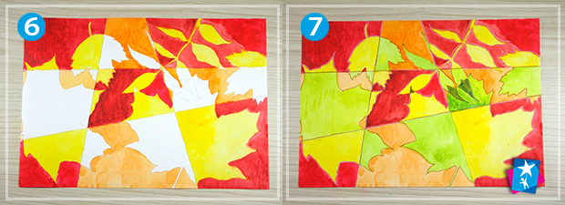 Тільки після повного висихання шару починаємо заповнювати жовтою фарбою ті частини листочків, що потрапили в ділянки 1, 3, 7, 9. Знову даємо час на висихання, і так будемо робити щоразу після нанесення нового кольору.