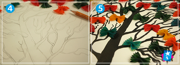 Намалюйте на міцній паперовій основі стовбур дерева з розлогими гілками. Тепер поступово і рівномірно викладіть всі бантики на гілки, а коли розкладка вам сподобається — підклейте кожен елемент.