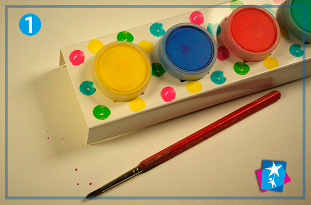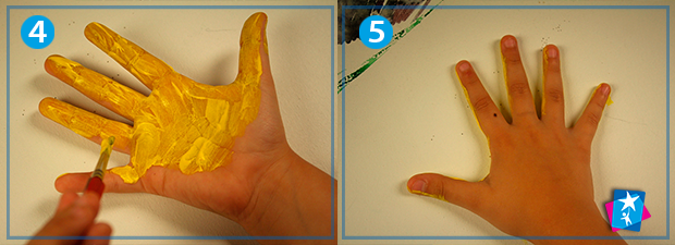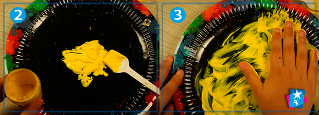 Викладіть кілька ложечок жовтої фарби на тарілку. Попросіть дитину опустити туди руку та зафарбувати таким чином долоньку. Придивіться, чи добре колір вкрив всю поверхню руки, якщо потрібно, нанесіть додаткові штрихи пензликом.
