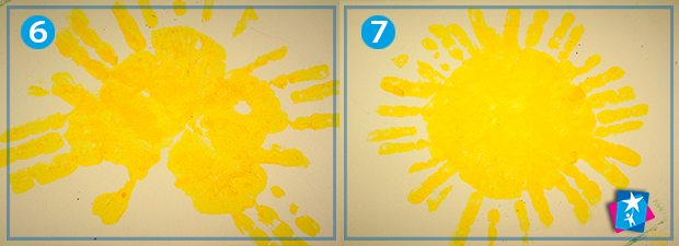 Посередині великого заґрунтованого полотна почніть робити долонею відтиски. Намалюйте таким чином фігуру у вигляді сонечка з променями назовні. Якщо десь не вистачає промінців, нанесіть їх окремо. Частіше занурюйте руку у фарбу, щоб центральний об’єкт залишався яскравим.