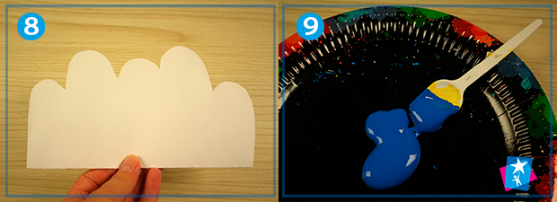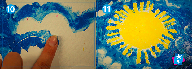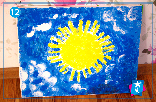 Виріжте паперову маску з формату А4 у вигляді простої хмаринки. Видавіть у тарілку синьої або блакитної фарби. Прикладіть маску-хмарку на картину довкола сонця, пальцями у синій фарбі пройдіться по контуру. Заберіть маску з паперу та прикладіть нижче, повторіть.