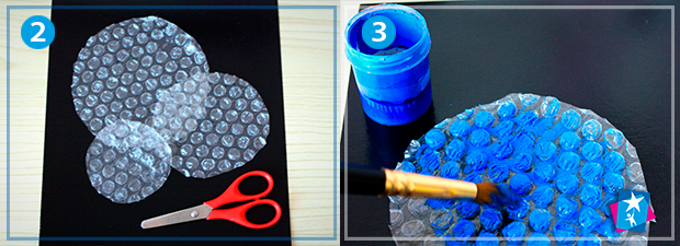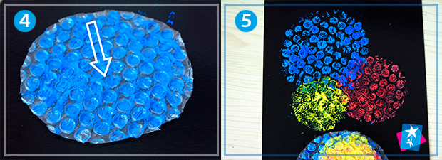 Виріжте з пакувальної плівки з пухирцями три кола різного розміру. Це будуть загальні нариси ваших квіточок. Нанесіть фарбу на перше коло та відпечатайте на темну основу у верхній частині роботи. Те ж саме зробіть з іншими двома колами, щоб вони перекривали сусідні зафарбовані ділянки. У проекті використано синю, рожеву та жовту фарби для квітів.