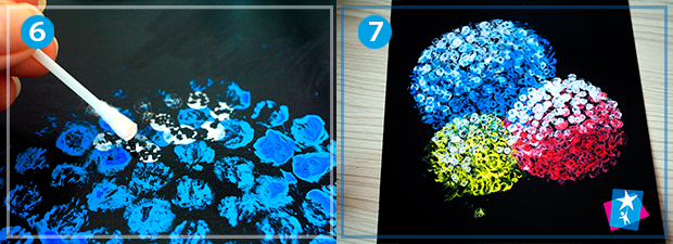 Коли фарби трохи підсохнуть, можна надавати квіткам форми. Для цього опускаємо ватну паличку у білу фарбу і точками зафарбовуємо бутони у верхній частині. Якщо ви вирішили, що світло падає зверху зліва, там має бути найбільше скупчення світлих крапочок, насиченість яких поступово зменшується до низу. Протилежний правий нижній сектор зафарбовуємо також ватними паличками, але беремо колір самої квітки.