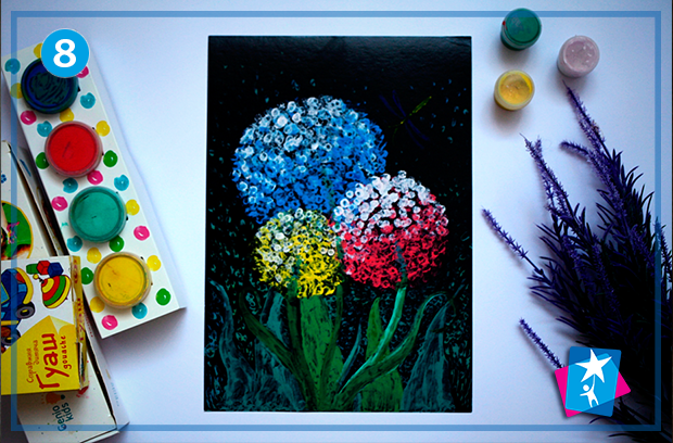 Навіть найменші діти отримають ефектний та яскравий результат. Для цього не потрібна техніка живопису, а лише знання кількох простих лайфхаків. Квіти отримують форму за допомогою "пупирки", а розподіл світла й тіні робиться ватними паличками. Все дуже просто!