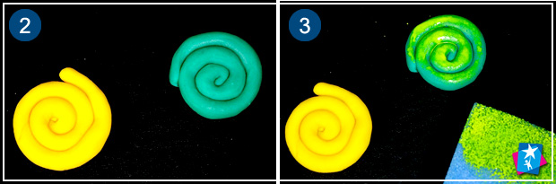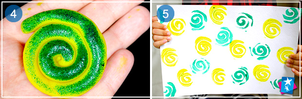 Для штампування знадобиться сам штамп, а також подушечка з чорнилом чи фарбою. Розкачуємо із пластиліну ковбаску, а потім скручуємо її у спіраль. Частину губки, трохи зволоженої, покриваємо шаром фарби. Торкаємося губкою до пластилінового фактурного штампу. Ставимо відтиск на папері.