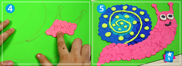 Намалюйте простий ескіз у вигляді равлика або іншої тварини, комахи, предмета. Почніть викладати перший ряд кульок з тіста, натискайте на них, продовжуйте ряди, формуючи мазки по формі об’єкта. Малюнок вийде яскравішим, якщо тіло равлика і його мушля будуть контрастними. Не забудьте в кінці роботи додати очі і посмішку.