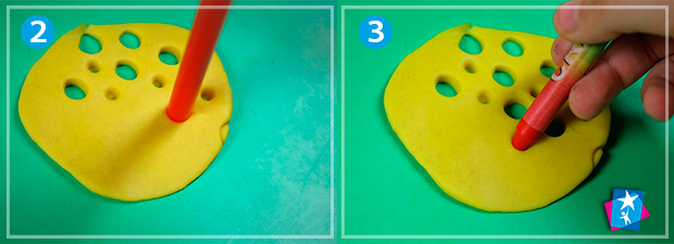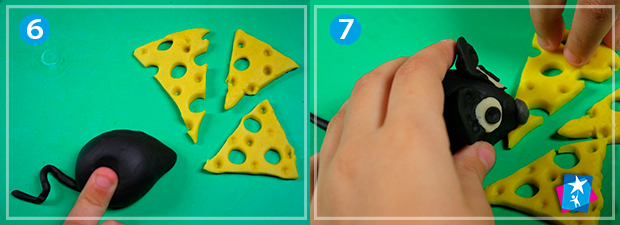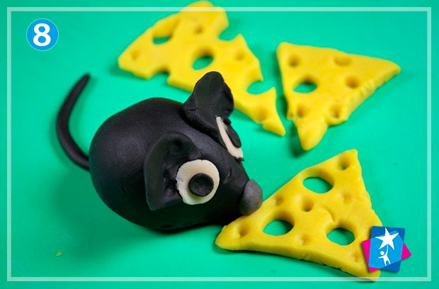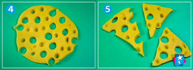 Почнемо зі створення сиру. Шматок жовтого пластиліну розминаємо, формуємо "млинець", перегортаємо іншим боком, щоб його поверхня була рівною, без відбитків пальців. Трубочкою видавлюємо дірки на поверхні сиру. На порожніх ділянках пройдемося тупим восковий олівцем, злегка надавлюючи. Потім наріжемо сир на трикутні шматочки.