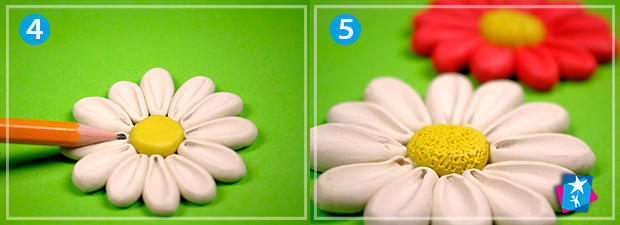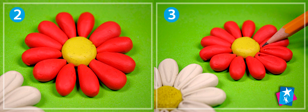 Скатайте кульку із пластиліну жовтого кольору і вкладіть на папір, трохи сплюсніть. Це буде серединка майбутньої квітки. Тепер скатайте 12 менших кульок однакового розміру іншого кольору, наприклад, білого. З кожної сформуйте краплевидну пелюстку та прикладайте до серцевини симетрично: зверху і знизу, справа і зліва. Далі заповнюйте простір, що залишився, вкладаючи пелюстки під кутом 180⁰.