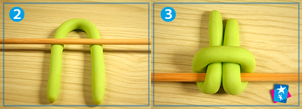Розімніть пластилін та скрутіть із нього товсту довгу ковбаску. Покладіть її у вигляді підкови, як на фото 2. Зверху вкладіть дерев'яну паличку перпендикулярно кінцям, приблизно на третину відступивши від верху. Просуньте кінці ковбаски у маленьку петлю, що утвориться після піднімання верхньої частини. В результаті маєте отримати фігуру, як на фото 3.