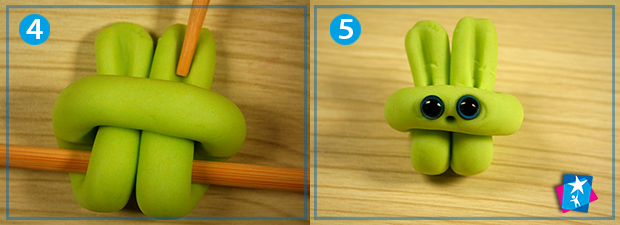 Кінчиком другої палички злегка надавіть "вушка", які опинилися зверху. Обережно витягніть першу паличку. Середня горизонтальна частина виробу дуже просто перетворюється на мордочку: вставляємо оченята, проколюємо кінчиком палички рот.