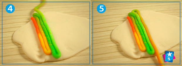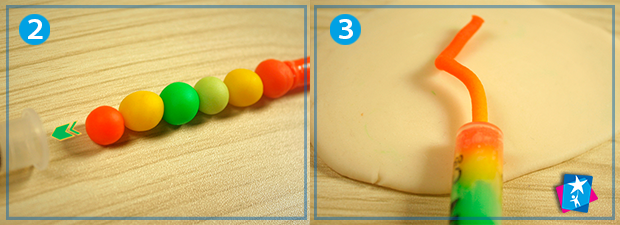 Сформуйте основу: у нас це добре розкатаний шматочок світлого пластиліну. Після цього з силою тисніть на поршень і поступово видавлюйте на поверхню основи тонку різнокольорову смужку. Кольори виходитимуть у тій послідовності, яку ви заклали у шприц.