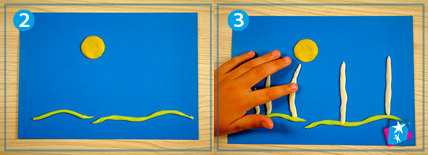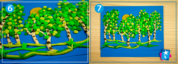 З жовтого пластиліну сформуйте сонце та вкладіть це яскраве коло на основу. Формуйте тонкі світло-зелені ковбаски з пластиліну та невеликими горизонтальними хвильками вкладайте у нижній частині листа. Це буде травичка на задньому плані. Білі пластилінові ковбаски перетворюються на березові стовбури: їх притискайте у вертикальному напрямку. Мініатюрні плямки на корі робляться з чорного або сірого пластиліну.