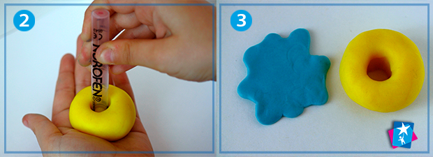 Розімніть пластилін, скачайте велику кульку. Трохи сплюсніть. Широкою частиною шприцу або товстим маркером продавіть посередині отвір. Згладьте нерівності пальцями.
