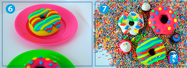 Розкачайте у тонкий шар пластилін контрастного кольору. Виріжте хмаринку. Покладіть на пончик та притисніть середину пальцями. За допомогою мірного шприцу видавіть різні за довжиною частини — короткі й довгі. Задекоруйте ваші пончики різнокольоровими смужками та кружечками.