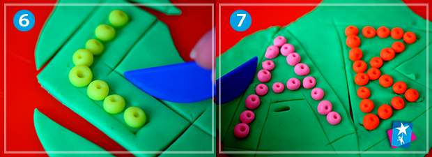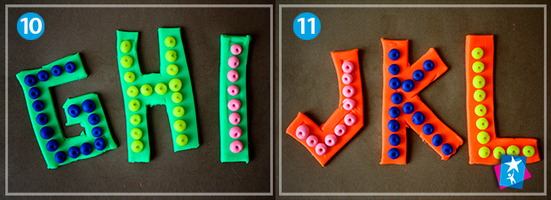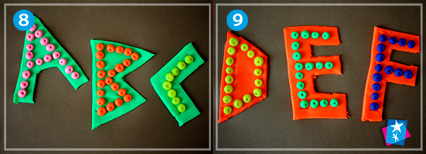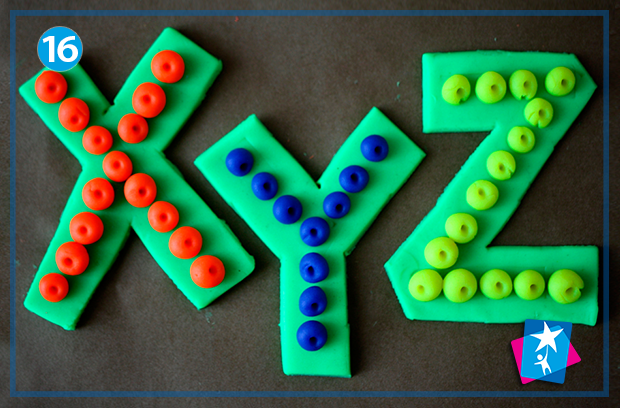 Повторення алфавіту ніколи не зайве. Ми пропонуємо створити відбитки літер на пластиліні, після чого заповнити їх яскравими кульками та вирізати по контуру. Замість цілої абетки можна просто викласти своє ім'я або будь-яке слово.