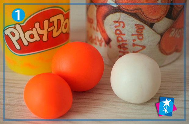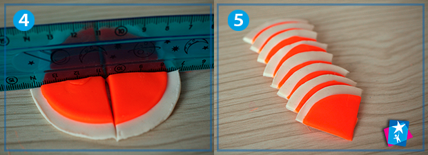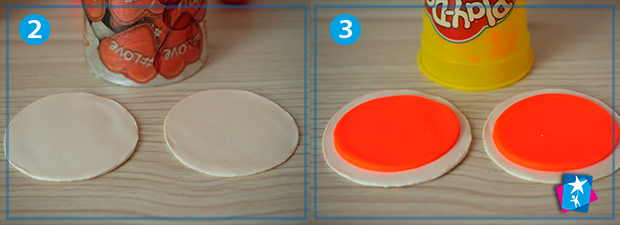 Візьміть пластилін двох кольорів, наприклад, білого і помаранчевого. Розімніть білу масу в руках, розкачайте у тонкий шар (але щоб не рвався) та продавіть більшою чашкою круг. Те ж саме треба проробити з оранжевим пластиліном, але діаметр має бути меншим. Всього нам треба два подвійних кола.