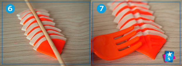 Продавіть олівцем або паличкою для суші посередині, по осі симетрії. Пройдіться виделкою по краях, щоб обережно надати хвилястої фактури. Зліпіть серцевину квітки – невеличкий валик, що по довжині збігається з шириною наших секторів-пелюсток.