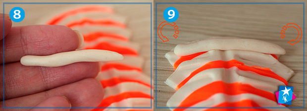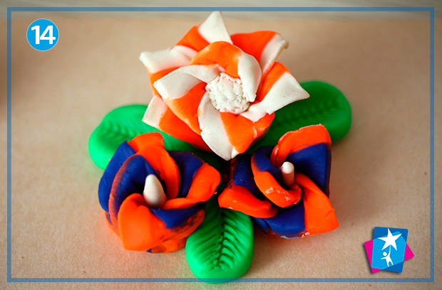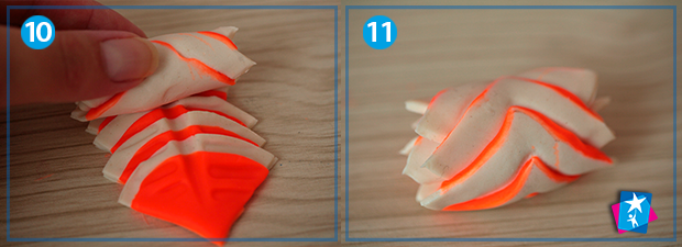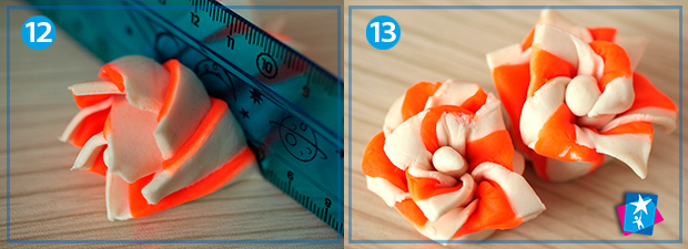 Покладіть серцевину зверху і починайте закручувати пластилін зверху вниз, як на фото 9, 10, 11. Отриману фігуру-рол розріжте лінійкою навпіл, і у вас одразу вийде пара квіточок, які треба красиво розкрити. Те ж саме можна зробити з меншою кількістю пелюсток і використати інакші кольори.