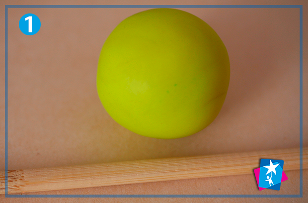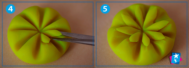Скачайте з великого шматка пластиліну кулю. Трішки сплюсніть. Намітьте суші-паличкою 4 лінії – спершу хрест-навхрест, а потім буквою «Х». Ми отримали розмітку для створення пелюсток нашої квітки.