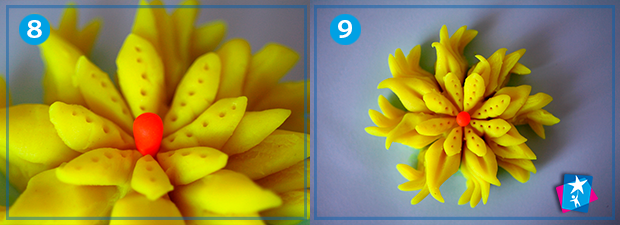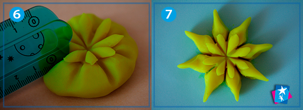 В кожному секторі треба зробити невеликий надріз ножицями, як на фото 4. Це дуже просто. На нашому пластиліновому калачику залишилася розмітка, її треба розділити (розрізати) лінійкою. І пальцями сформувати пелюстки у нижньому шарі, як на мал. 7.